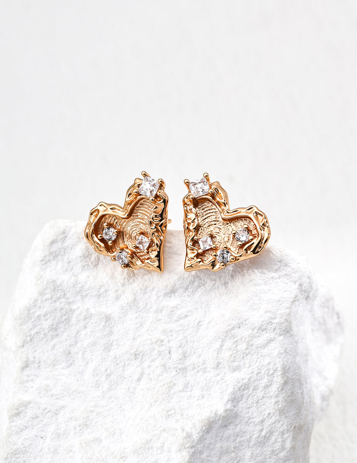 | Goldene Herzrahmen mit fließender Textur, besetzt mit Zirkonen. Inspiriert von schmelzender Romantik, die Leidenschaft in alltägliches Funkeln einfriert. |